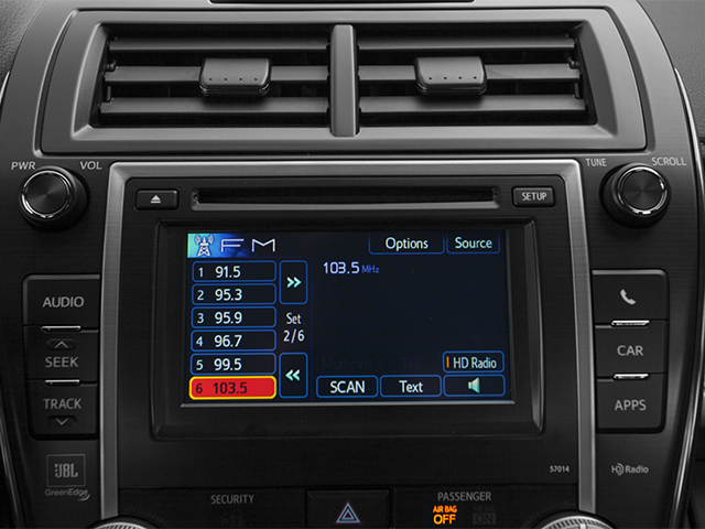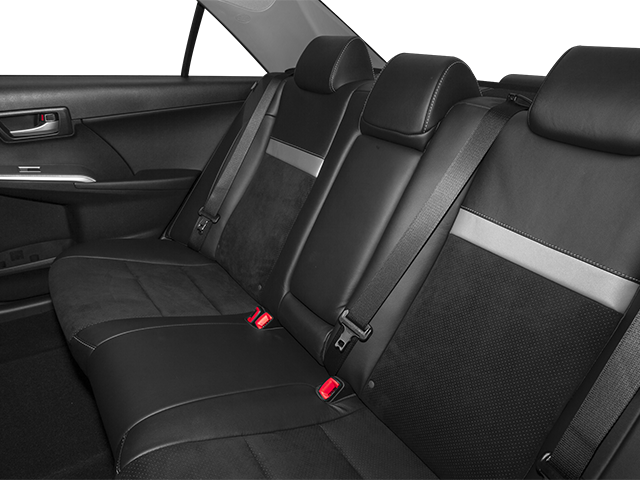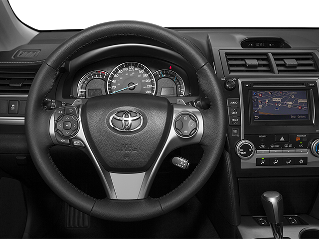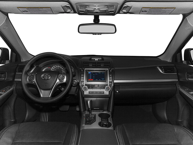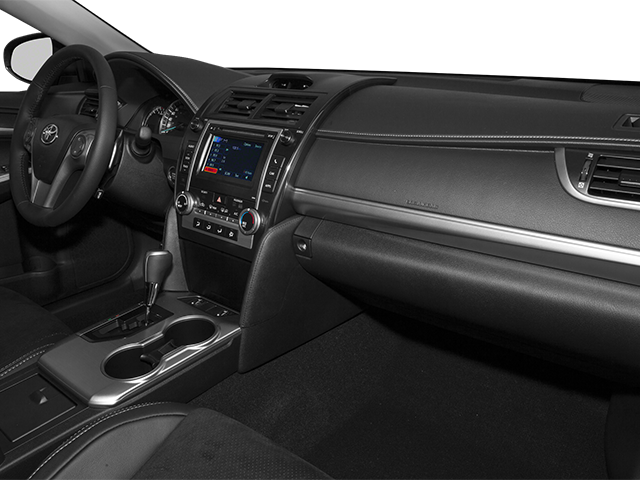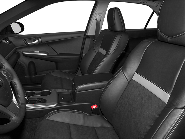 This 2014 Toyota Camry is equipped with Black Artificial Leather, 4-Wheel Disc Brakes, 6 Speakers, 7.0J x 17 Alloy Wheels, ABS brakes, Air Conditioning, Alloy wheels, AM/FM radio, Brake assist, Bumpers: body-color, CD player, Delay-off headlights, Driver door bin, Driver vanity mirror, Dual front impact airbags, Dual front side impact airbags, Electronic Stability Control, Four wheel independent suspension, Front anti-roll bar, Front Bucket Seats, Front Center Armrest, Front fog lights, Front reading lights, Front Sport Bucket Seats, Fully automatic headlights, Heated door mirrors, Illuminated entry, Knee airbag, Leather Shift Knob, Low tire pressure warning, Occupant sensing airbag, Outside temperature display, Overhead airbag, Overhead console, Panic alarm, Passenger door bin, Passenger vanity mirror, Power door mirrors, Power steering, Power windows, Radio: AM/FM/CD Player w/6.1 Touch Screen, Rear anti-roll bar, Rear seat center armrest, Rear side impact airbag, Rear window defroster, Remote keyless entry, SofTex Seat Trim, Speed control, Speed-sensing steering, Split folding rear seat, Spoiler, Steering wheel mounted audio controls, Tachometer, Telescoping steering wheel, Tilt steering wheel, Traction control, Trip computer, and Variably intermittent wipers.