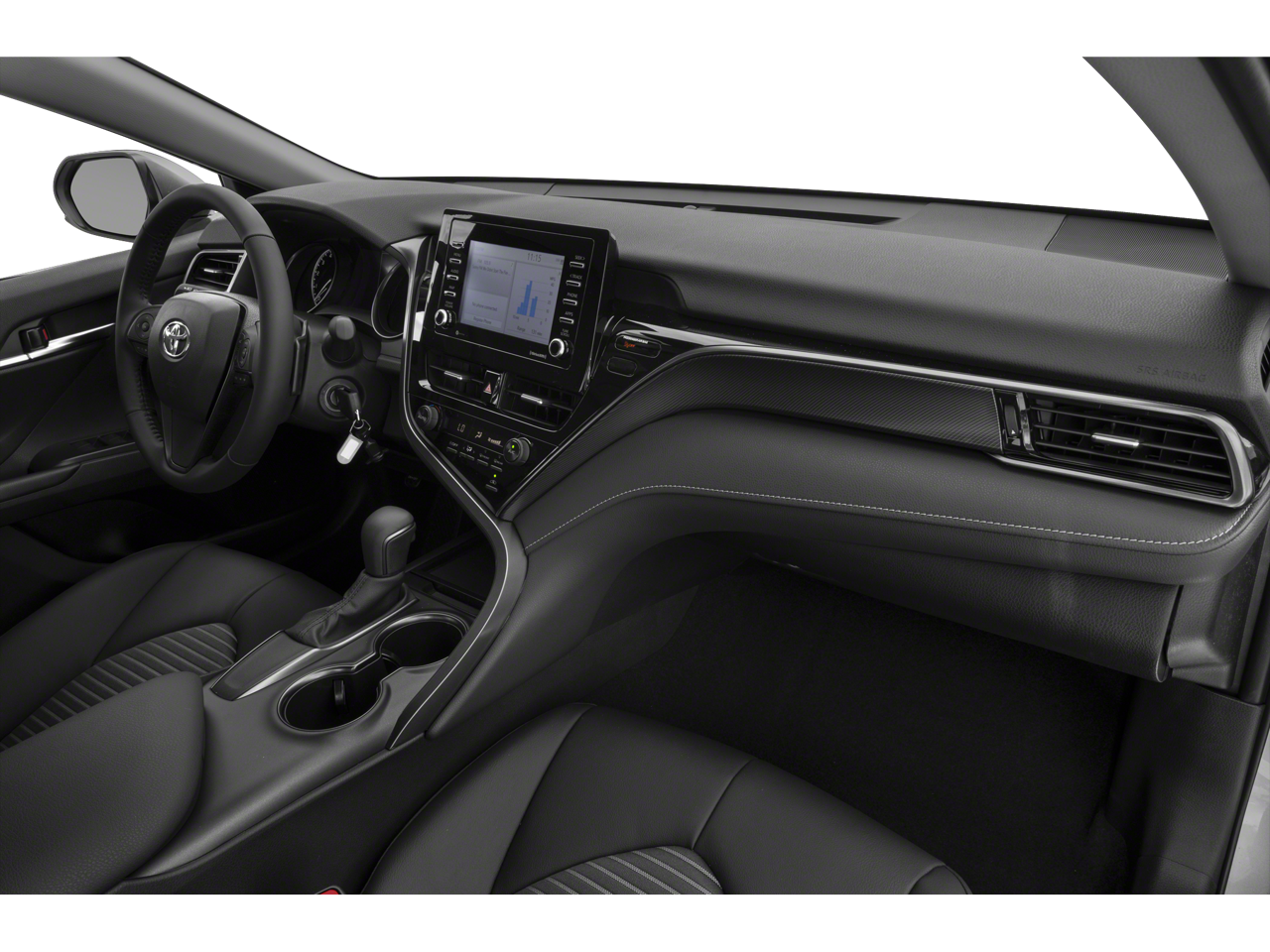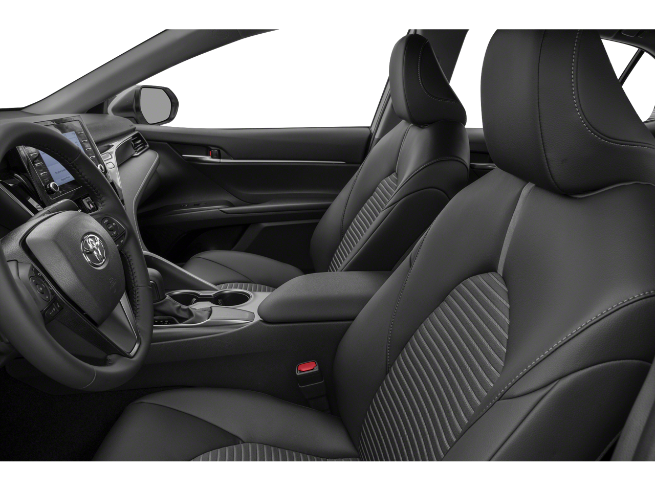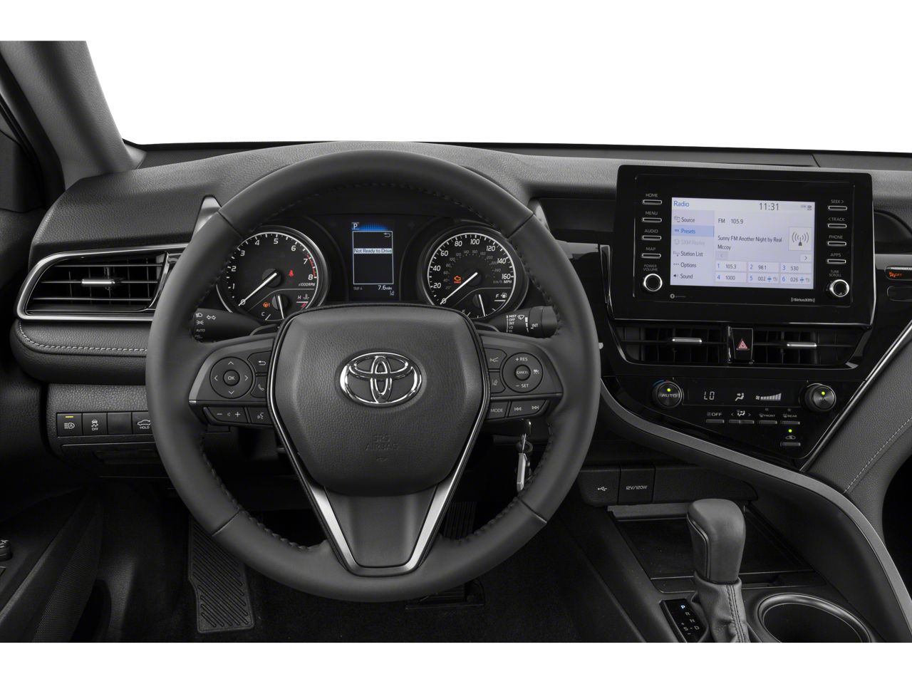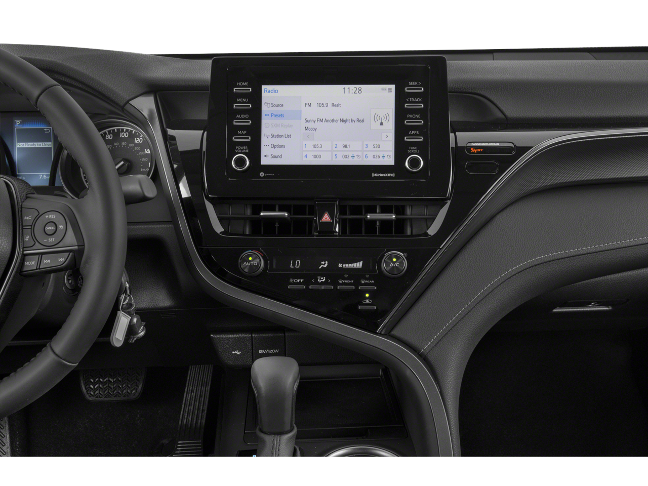 This 2021 Toyota Camry is equipped with Black Cloth, 4-Wheel Disc Brakes, 6 Speakers, ABS brakes, Air Conditioning, Alloy wheels, AM/FM radio: SiriusXM, Apple CarPlay/Android Auto, Auto High-beam Headlights, Automatic temperature control, Brake assist, Bumpers: body-color, Delay-off headlights, Driver door bin, Driver vanity mirror, Dual front impact airbags, Dual front side impact airbags, Electronic Stability Control, Emergency communication system: Safety Connect with 1-year trial, Exterior Parking Camera Rear, Fabric Seat Trim w/Sport SofTex, Four wheel independent suspension, Front anti-roll bar, Front Bucket Seats, Front Center Armrest, Front reading lights, Fully automatic headlights, Illuminated entry, Knee airbag, Low tire pressure warning, Occupant sensing airbag, Outside temperature display, Overhead airbag, Overhead console, Panic alarm, Passenger door bin, Passenger vanity mirror, Power door mirrors, Power driver seat, Power steering, Power windows, Radio data system, Radio: AM/FM Audio System, Rear anti-roll bar, Rear seat center armrest, Rear side impact airbag, Rear window defroster, Remote keyless entry, Security system, Speed control, Speed-sensing steering, Split folding rear seat, Spoiler, Steering wheel mounted audio controls, Tachometer, Telescoping steering wheel, Tilt steering wheel, Traction control, Trip computer, Variably intermittent wipers, and Wheels: 8.0J x 18 Black Machined-Finish Alloy.