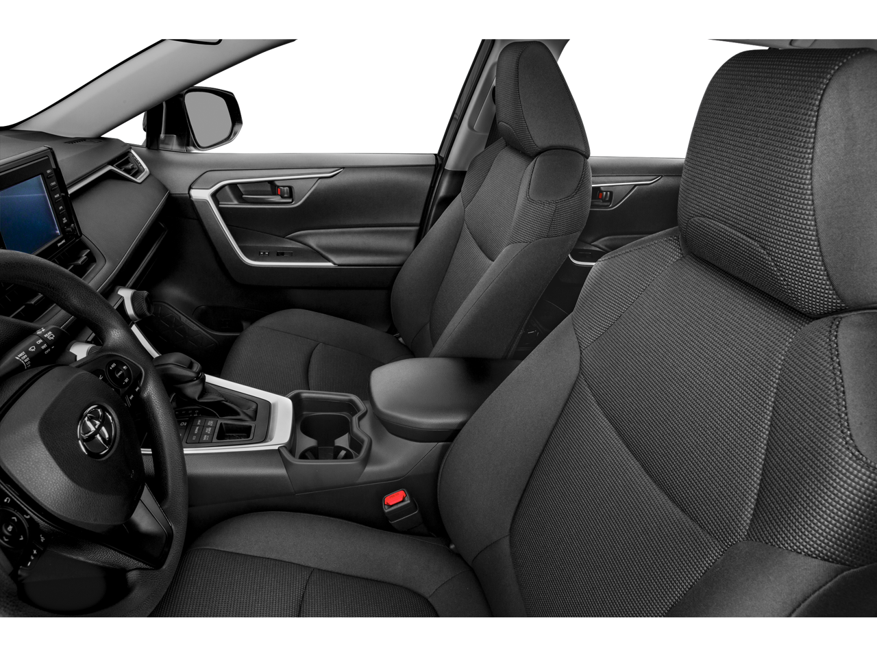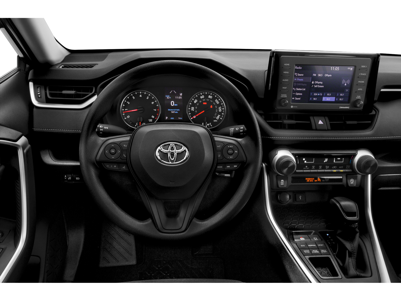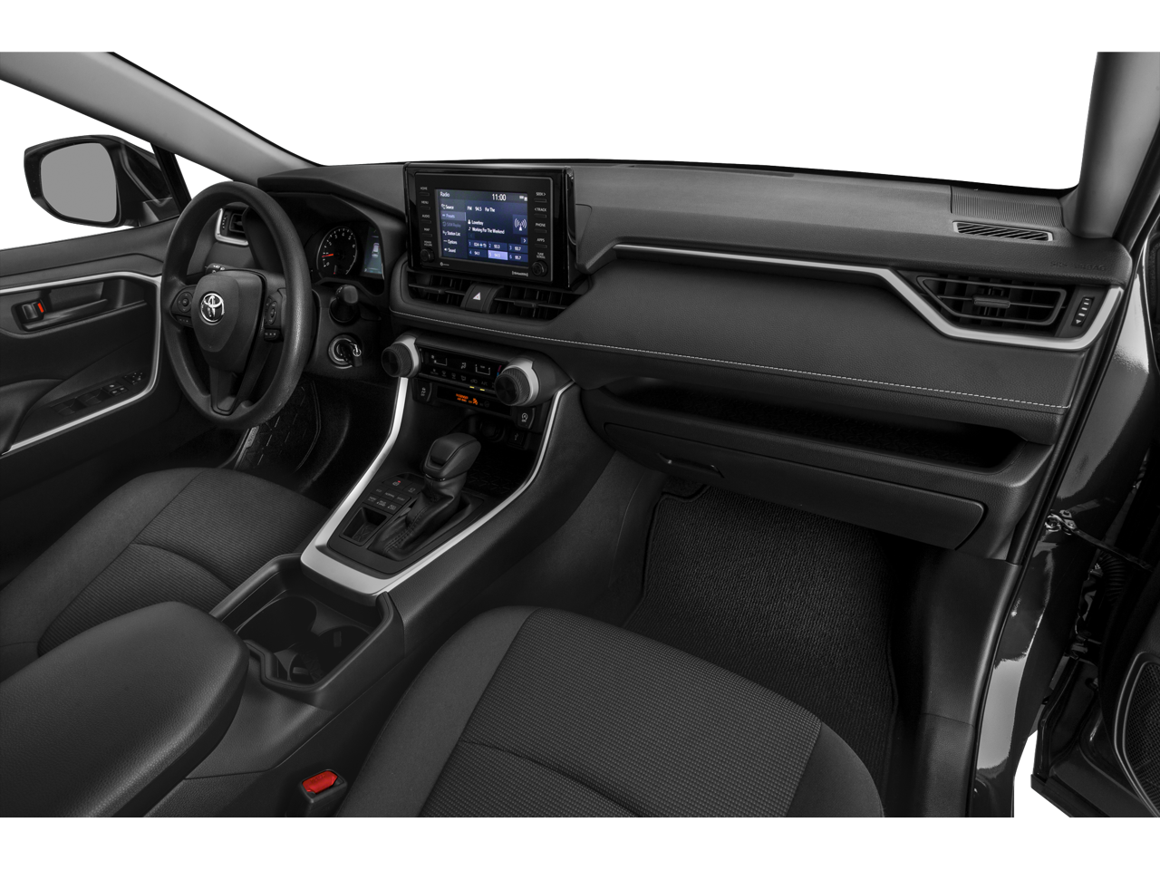 This 2021 Toyota RAV4 is equipped with AWD, Black Cloth, 17 Steel Wheels, 4-Wheel Disc Brakes, 6 Speakers, ABS brakes, Air Conditioning, AM/FM radio: SiriusXM, AM/FM Stereo, Apple CarPlay/Android Auto, Auto High-beam Headlights, Axle Ratio: 3.177, Brake assist, Bumpers: body-color, Driver door bin, Driver vanity mirror, Dual front impact airbags, Dual front side impact airbags, Electronic Stability Control, Emergency communication system, Exterior Parking Camera Rear, Fabric Seat Trim, Four wheel independent suspension, Front anti-roll bar, Front Bucket Seats, Front Center Armrest, Front reading lights, Illuminated entry, Knee airbag, Low tire pressure warning, Occupant sensing airbag, Outside temperature display, Overhead airbag, Overhead console, Panic alarm, Passenger door bin, Passenger vanity mirror, Power door mirrors, Power steering, Power windows, Radio data system, Rear anti-roll bar, Rear seat center armrest, Rear window defroster, Rear window wiper, Remote keyless entry, Roof rack: rails only, Speed control, Speed-sensing steering, Split folding rear seat, Spoiler, Steering wheel mounted audio controls, Tachometer, Telescoping steering wheel, Tilt steering wheel, Traction control, and Trip computer.