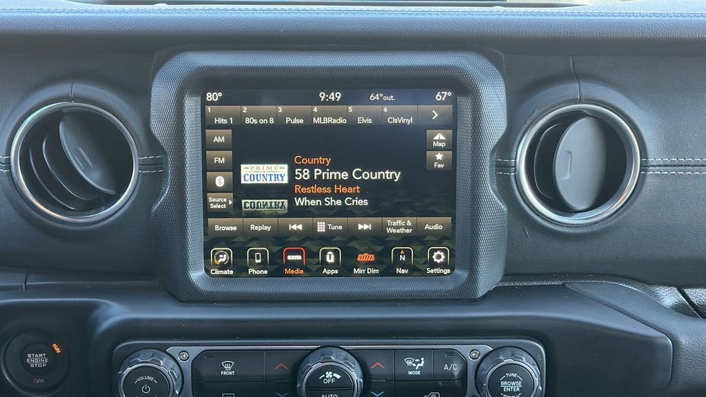 This 2022 Jeep Wrangler is equipped with Quick Order Package 22G, Trailer Tow & HD Electrical Group (240 Amp Alternator, 7 & 4 Pin Wiring Harness, 700 Amp Maintenance Free Battery, Auxiliary Switches, and Class II Receiver Hitch), Navigation System, 110 MPH Vehicle Max Speed Calibration, 3.45 Rear Axle Ratio, 4-Wheel Disc Brakes, 9 Speakers, ABS brakes, Air Conditioning, Alloy wheels, AM/FM radio: SiriusXM, Anti-Spin Differential Rear Axle, Apple CarPlay/Android Auto, Auto-dimming Rear-View mirror, Automatic temperature control, Aux Battery, Brake assist, Cloth Low-Back Bucket Seats, Compass, Delay-off headlights, Driver door bin, Driver vanity mirror, Dual front impact airbags, Dual front side impact airbags, Electronic Stability Control, Emergency communication system: SiriusXM Guardian, Engine Oil Cooler, Front anti-roll bar, Front Bucket Seats, Front Center Armrest w/Storage, Front dual zone A/C, Front fog lights, Front reading lights, Fully automatic headlights, Garage door transmitter, Heated door mirrors, Heavy Duty Suspension w/Gas Shocks, Illuminated entry, Integrated roll-over protection, Leather steering wheel, Low tire pressure warning, Manufacturer's Statement of Origin, Non-Lock Fuel Cap w/o Discriminator, Occupant sensing airbag, Outside temperature display, Panic alarm, ParkView Rear Back-Up Camera, Passenger door bin, Passenger vanity mirror, Power door mirrors, Power steering, Power Top Quarter Window Storage Bag, Power windows, Radio data system, Radio: Uconnect 4C Nav w/8.4 Display, Rear anti-roll bar, Rear reading lights, Remote keyless entry, Removable Rear Quarter Windows, Security system, Sky 1-Touch Power Top, Speed control, Split folding rear seat, Steering wheel mounted audio controls, Stop-Start Dual Battery System, Tachometer, Telescoping steering wheel, Tilt steering wheel, Traction control, Trip computer, Variably intermittent wipers, Voltmeter, and Wheels: 18 x 7.5 Polished w/Gray Spokes.