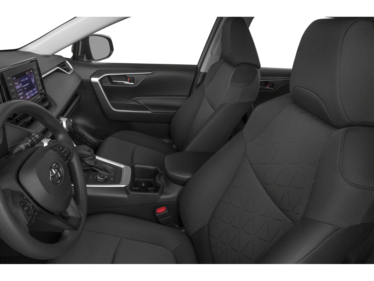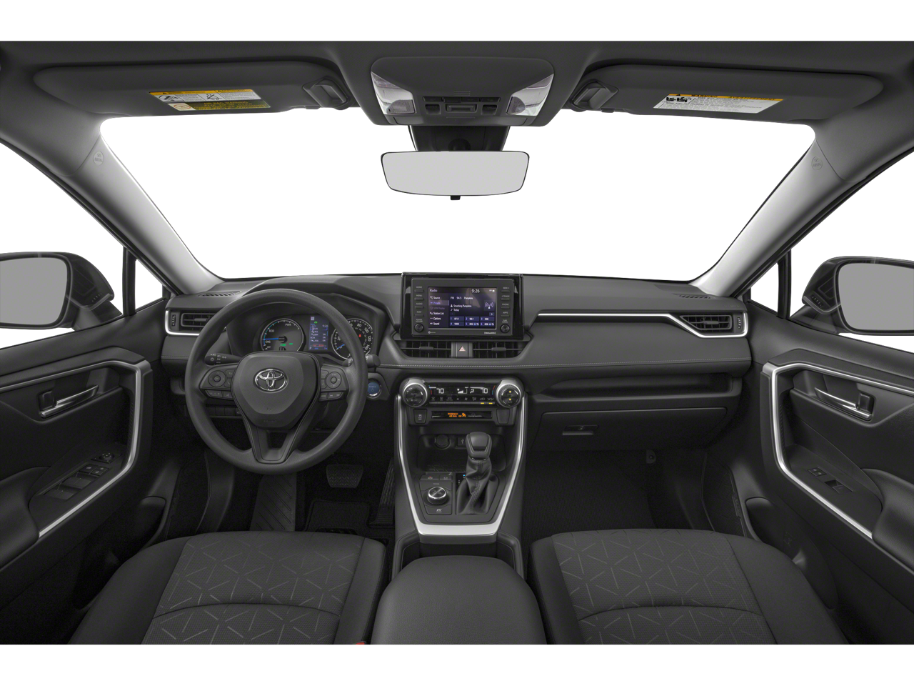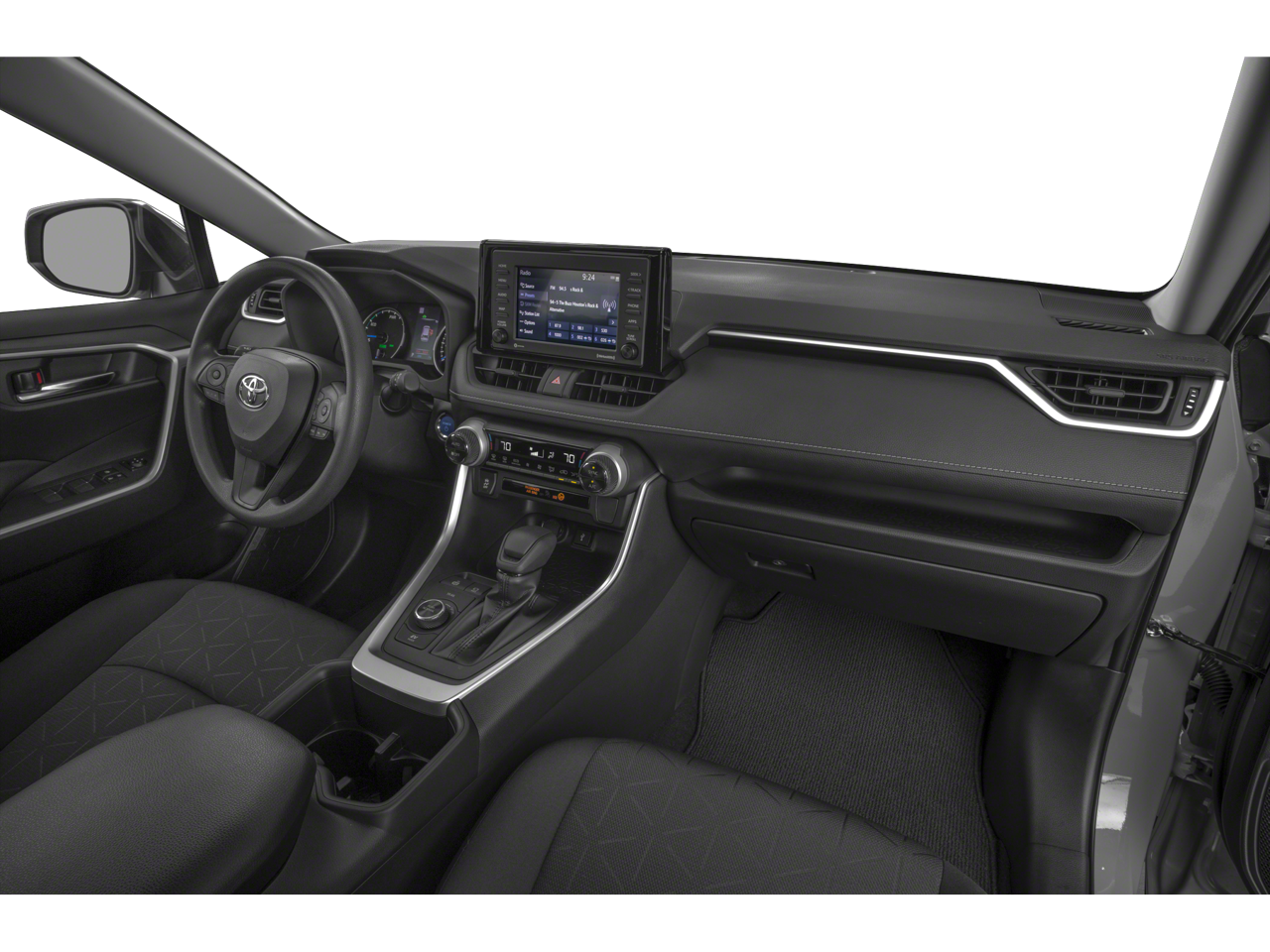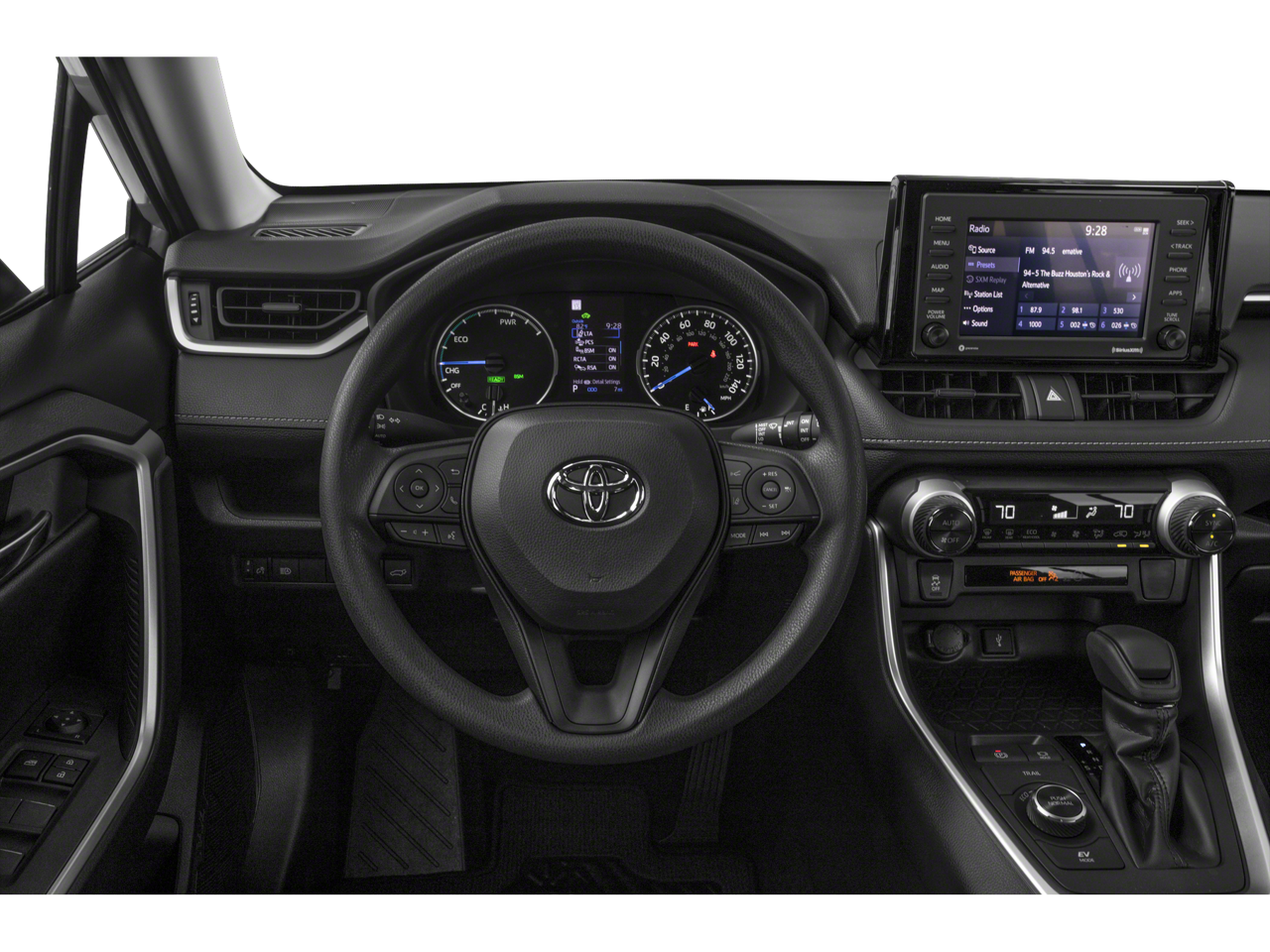 This 2022 Toyota RAV4 Hybrid is equipped with Convenience Package (3 Spoke Leather Steering Wheel), 2.5L 4-Cylinder, 4-Wheel Disc Brakes, 6 Speakers, ABS brakes, Air Conditioning, Alloy wheels, AM/FM radio: SiriusXM, AM/FM Stereo, Apple CarPlay/Android Auto, Auto High-beam Headlights, Automatic temperature control, Axle Ratio: TBD, Brake assist, Bumpers: body-color, Delay-off headlights, Driver door bin, Driver vanity mirror, Dual front impact airbags, Dual front side impact airbags, Electronic Stability Control, Emergency communication system: Safety Connect with 1-year trial, Exterior Parking Camera Rear, Four wheel independent suspension, Front anti-roll bar, Front Bucket Seats, Front Center Armrest, Front Door Smart Key System w/Push Button Start, Front dual zone A/C, Front Fog & Driving Lamp, Front fog lights, Front reading lights, Front Sport Seats, Fully automatic headlights, Heated door mirrors, Illuminated entry, Knee airbag, Lane Departure Warning System, Leather Shift Knob, Low tire pressure warning, Occupant sensing airbag, Outside temperature display, Overhead airbag, Overhead console, Panic alarm, Passenger door bin, Passenger vanity mirror, Power door mirrors, Power driver seat, Power Liftgate, Power moonroof, Power steering, Power windows, Radio data system, Rear anti-roll bar, Rear seat center armrest, Rear window defroster, Rear window wiper, Remote keyless entry, Roof rack: rails only, SofTex Seat Trim, Speed control, Speed-sensing steering, Split folding rear seat, Spoiler, Steering wheel mounted audio controls, Telescoping steering wheel, Tilt steering wheel, Traction control, Trip computer, Turn signal indicator mirrors, Variably intermittent wipers, and Wheels: 18 x 7.0J 5-Spoke Sport Alloy.