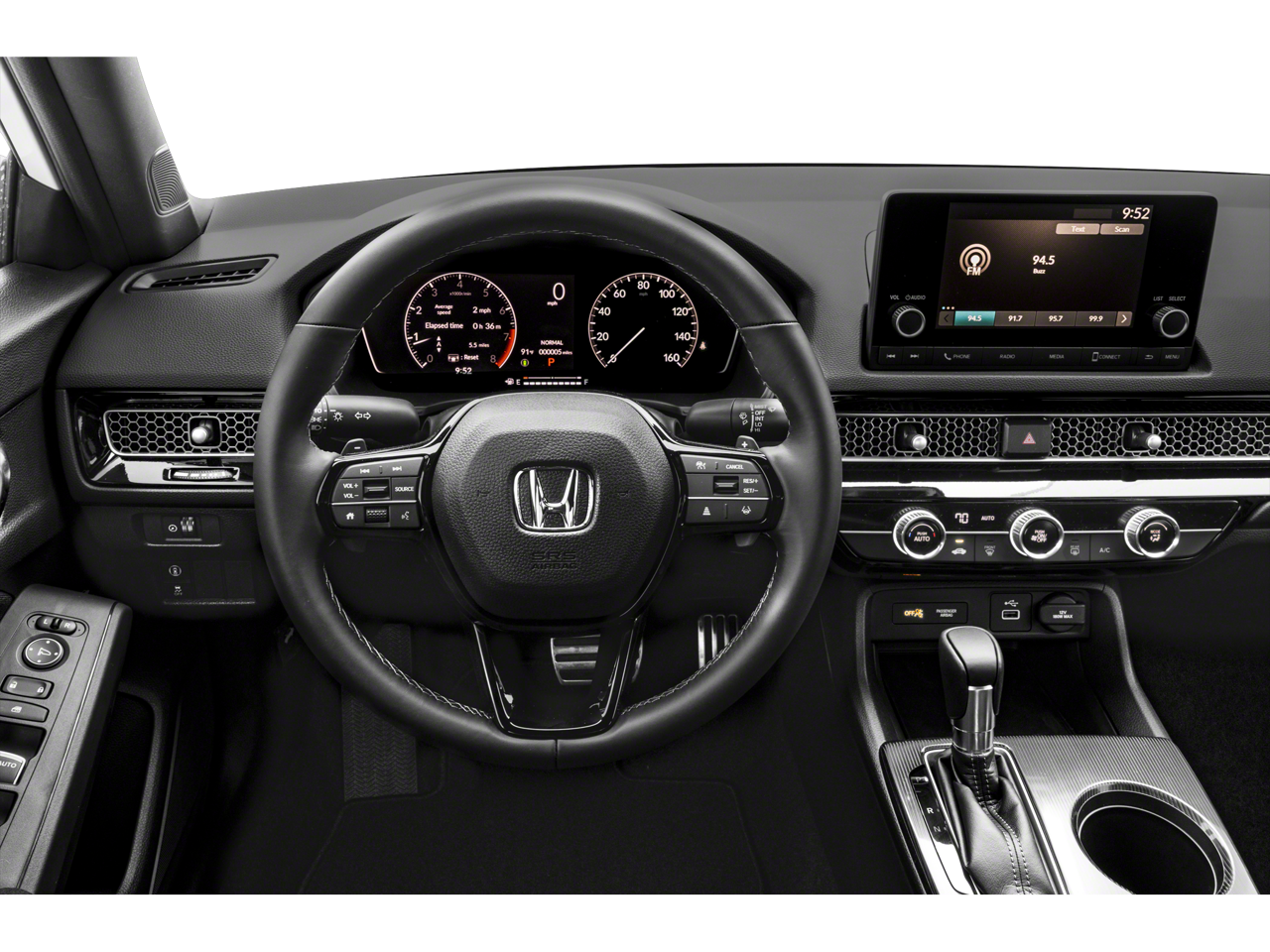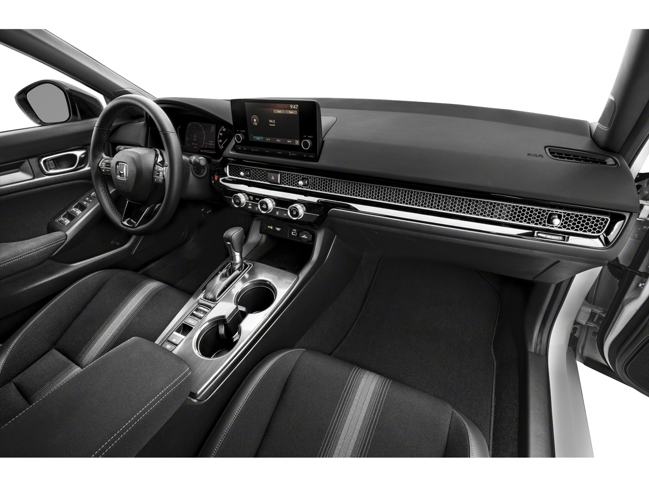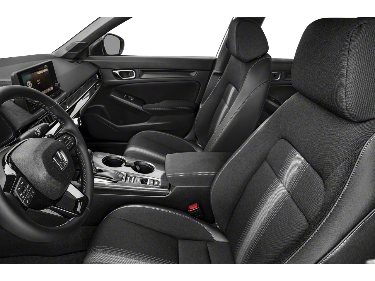 This 2023 Honda Civic is equipped with Black Cloth, 4-Wheel Disc Brakes, 8 Speakers, ABS brakes, Adaptive Cruise Control: Adaptive Cruise Control (ACC) with Low-Speed Follow, Air Conditioning, Alloy wheels, AM/FM radio, Apple CarPlay/Android Auto, Auto High-beam Headlights, Automatic temperature control, Brake assist, Bumpers: body-color, Cloth Seat Trim, Delay-off headlights, Driver door bin, Driver vanity mirror, Dual front impact airbags, Dual front side impact airbags, Electronic Stability Control, Emergency communication system: HondaLink, Exterior Parking Camera Rear, Four wheel independent suspension, Front anti-roll bar, Front Bucket Seats, Front Center Armrest, Front reading lights, Fully automatic headlights, Illuminated entry, Knee airbag, Leather Shift Knob, Leather steering wheel, Low tire pressure warning, Occupant sensing airbag, Outside temperature display, Overhead airbag, Panic alarm, Passenger door bin, Passenger vanity mirror, Power door mirrors, Power steering, Power windows, Radio data system, Radio: 180-Watt Audio System w/8 Speakers, Rear anti-roll bar, Rear side impact airbag, Rear window defroster, Remote keyless entry, Security system, Speed control, Speed-sensing steering, Steering wheel mounted audio controls, Tachometer, Telescoping steering wheel, Tilt steering wheel, Traction control, Trip computer, and Wheels: 18 Gloss Black Alloy.