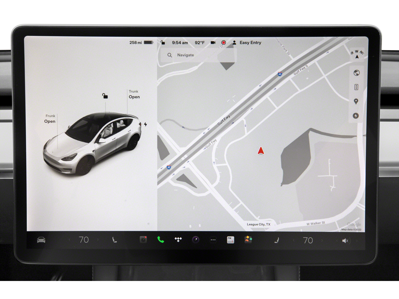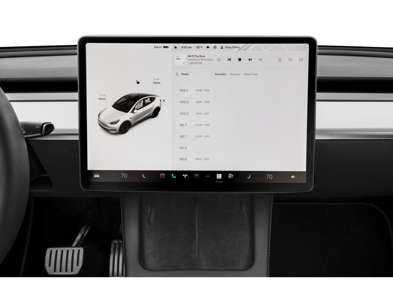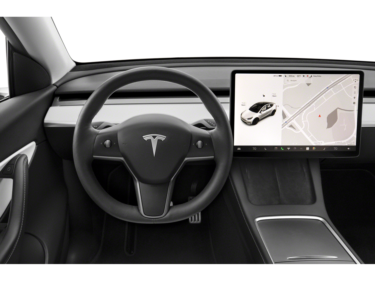 This 2023 Tesla Model Y is equipped with Navigation System, 14 Speakers, 4-Wheel Disc Brakes, 5 Seat Interior, 9.0 Axle Ratio, ABS brakes, Air Conditioning, Alloy wheels, Audio memory, Auto High-beam Headlights, Auto tilt-away steering wheel, Auto-dimming door mirrors, Auto-dimming Rear-View mirror, Automatic temperature control, Brake assist, Bumpers: body-color, Compass, Delay-off headlights, Driver door bin, Driver vanity mirror, Dual front impact airbags, Dual front side impact airbags, Electronic Stability Control, Emergency communication system, Exterior Parking Camera Rear, Four wheel independent suspension, Front anti-roll bar, Front Bucket Seats, Front Center Armrest, Front dual zone A/C, Front fog lights, Front reading lights, Fully automatic headlights, Genuine wood dashboard insert, Heated door mirrors, Heated front seats, Heated rear seats, Heated steering wheel, HVAC memory, Illuminated entry, Knee airbag, Lane Departure Warning System, Low tire pressure warning, Memory seat, Occupant sensing airbag, Outside temperature display, Overhead airbag, Passenger door bin, Passenger vanity mirror, Power door mirrors, Power driver seat, Power Liftgate, Power passenger seat, Power steering, Power windows, Premium Audio System, Radio data system, Rain sensing wipers, Rear reading lights, Rear seat center armrest, Rear window defroster, Security system, Speed control, Speed-sensing steering, Split folding rear seat, Steering wheel memory, Steering wheel mounted A/C controls, Steering wheel mounted audio controls, Telescoping steering wheel, Tilt steering wheel, Traction control, Trip computer, Variably intermittent wipers, Vegan Leather Seat Trim, and Wheels: 19 x 9.5 Gemini.