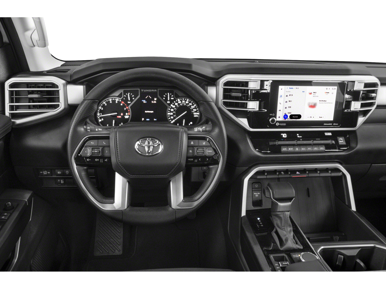 This 2023 Toyota Tundra is equipped with TRD Off-Road Premium Package (Bedside TRD Off Road Decal, Black Grille w/Chrome Surround, Front & Rear Mud Guards, Front Spoiler Delete, SofTex Seat Trim, and TRD Off-Road Suspension w/Bilstein Shocks), 4WD, Black w/Leather Seat Trim, ABS brakes, Active Cruise Control, Alloy wheels, Electronic Stability Control, Heated door mirrors, Illuminated entry, Low tire pressure warning, Remote keyless entry, Traction control, 18 Alloy Wheels, 3.31 Axle Ratio, 4-Way Adjustable Front Bucket Seats, 4-Wheel Disc Brakes, 9 Speakers, Air Conditioning, AM/FM radio: SiriusXM, Apple CarPlay/Android Auto, Auto High-beam Headlights, Automatic temperature control, Brake assist, Bumpers: body-color, Delay-off headlights, Driver door bin, Driver vanity mirror, Dual front impact airbags, Dual front side impact airbags, Emergency communication system: Safety Connect (10-year trial), Exterior Parking Camera Rear, Fabric Seat Trim (FB), Front anti-roll bar, Front Bucket Seats, Front Center Armrest, Front fog lights, Front reading lights, Front wheel independent suspension, Fully automatic headlights, Knee airbag, Occupant sensing airbag, Outside temperature display, Overhead airbag, Overhead console, Panic alarm, Passenger door bin, Passenger vanity mirror, Power door mirrors, Power steering, Power windows, Radio data system, Radio: Audio Multimedia System, Rear reading lights, Rear step bumper, Rear window defroster, Safety Connect, Security system, Speed control, Speed-sensing steering, Split folding rear seat, Steering wheel mounted audio controls, Tachometer, Telescoping steering wheel, Tilt steering wheel, Trip computer, Variably intermittent wipers, and Voltmeter.