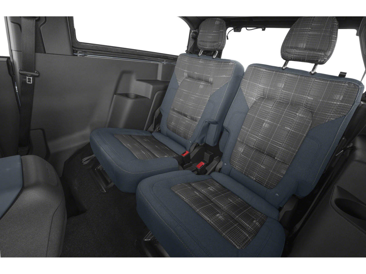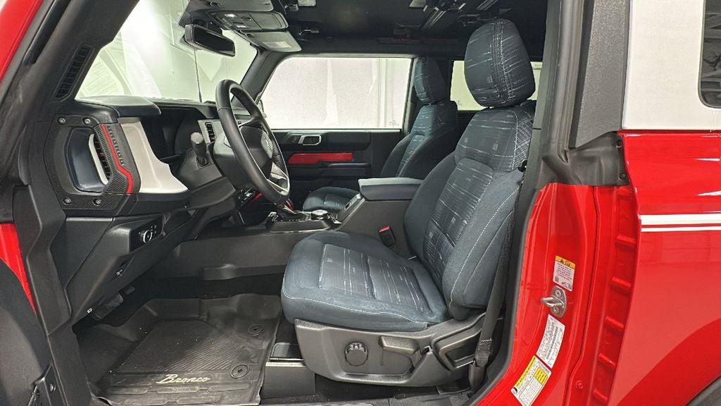 This 2024 Ford Bronco is equipped with Convertible HardTop, Navigation system: Connected Navigation, 4-Wheel Disc Brakes, 4.7 Axle Ratio, 7 Speakers, ABS brakes, Air Conditioning, Alloy wheels, AM/FM radio: SiriusXM with 360L, AM/FM Stereo, Auto High-beam Headlights, Auto-dimming Rear-View mirror, Automatic temperature control, Brake assist, Compass, Connected Navigation, Convertible roof lining, Delay-off headlights, Driver door bin, Driver vanity mirror, Dual front impact airbags, Dual front side impact airbags, Electronic Stability Control, Emergency communication system: 911 Assist, Exterior Parking Camera Rear, Front anti-roll bar, Front Bucket Seats, Front Center Armrest, Front dual zone A/C, Front fog lights, Front reading lights, Front wheel independent suspension, Fully automatic headlights, Glass rear window, Heated door mirrors, Heated front seats, Illuminated entry, Integrated roll-over protection, Leather Shift Knob, Low tire pressure warning, Occupant sensing airbag, Outside temperature display, Overhead airbag, Overhead console, Panic alarm, Passenger door bin, Passenger vanity mirror, Plaid Cloth Front Heated Bucket Seats, Power door mirrors, Power steering, Power windows, Radio data system, Rear window defroster, Rear window wiper, Remote keyless entry, Security system, SiriusXM Radio w/360L, Speed control, Split folding rear seat, Steering wheel mounted audio controls, SYNC 4, Tachometer, Telescoping steering wheel, Tilt steering wheel, Traction control, Trip computer, Variably intermittent wipers, and Wheels: 17 Unique White.
