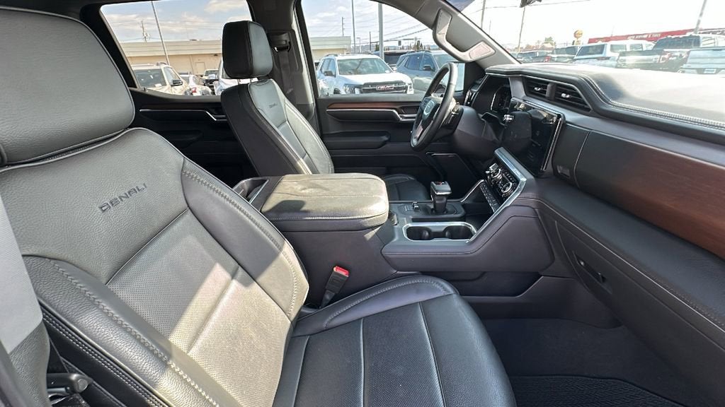 This 2024 GMC Sierra 1500 is equipped with Preferred Equipment Group 5SA (120-Volt Bed Mounted Power Outlet, 120-Volt Interior Power Outlet, 170 Amp Alternator, 2 Charge/Data USB Ports Inside Center Console, 2 Type-C Charge-Only Rear USB Ports, 2 USB Ports, Auto-Locking Rear Differential, Auxiliary External Transmission Oil Cooler, Bed View Camera, Chrome Header w/Signature Denali Chrome Grille, Chrome Recovery Hooks, Chrome Wheel To Wheel Assist Steps, Color-Keyed Carpeting Floor Covering, Deep-Tinted Glass, Electric Rear-Window Defogger, Floor-Mounted Center Console, Front Rain-Sensing Wipers, GMC Connected Access Capable, HD Surround Vision, Heated 2nd Row Outboard Seats, Heated Driver & Front Outboard Passenger Seating, Heavy-Duty Air Filter, Hill Descent Control, Hitch View, In-Vehicle Trailering System App, Integrated Trailer Brake Controller, Keyless Open & Start, LED Cargo Area Lighting, OnStar & GMC Connected Services Capable, Perimeter Lighting, Power Door Locks, Power Front Passenger Windows w/Express Up/Down, Power Front Windows w/Driver Express Up/Down, Power Rake & Telescoping Steering Column, Power Rear Windows w/Express Down, Power Sliding Rear Window w/Rear Defogger, Premium Bose 7-Speaker Sound System, Push Button Start, Rear Cross Traffic Braking, Rear Pedestrian Detection, Rear Wheelhouse Liners, Remote Vehicle Starter System, SiriusXM w/360L, Spray-On Pickup Bedliner w/Denali Logo, Steering Wheel Audio Controls, Theft Deterrent System (Unauthorized Entry), Trailer Camera Provisions, Trailer Side Blind Zone Alert, Ultrasonic Front & Rear Park Assist, Universal Home Remote, Ventilated Driver & Front Passenger Seats, Wi-Fi Hotspot Capable, and Wireless Charging), Technology Package (Multicolor 15 Diagonal Head-Up Display and Rear Camera Mirror), Trailering Package (Hitch Guidance), GMC Certified Pre-Owned Certified, 10-Speed Automatic, 4WD, Jet Black Leather, Navigation System, 12-Way Power Driver Seat Adjuster w/Lumbar, 12-Way