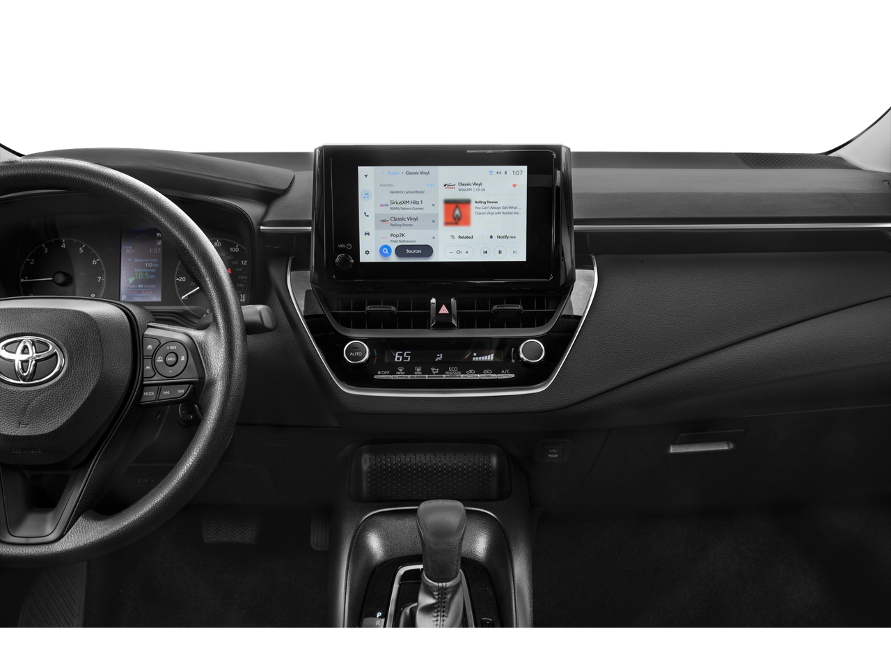 This 2024 Toyota Corolla is equipped with 16 Steel Wheels w/Covers, 4-Wheel Disc Brakes, 6 Speakers, ABS brakes, Air Conditioning, AM/FM radio: SiriusXM, Auto High-beam Headlights, Automatic temperature control, Brake assist, Bumpers: body-color, Delay-off headlights, Driver door bin, Driver vanity mirror, Dual front impact airbags, Dual front side impact airbags, Electronic Stability Control, Emergency communication system: Safety Connect (up to 10-year trial subscription), Exterior Parking Camera Rear, Fabric Seat Trim, Front anti-roll bar, Front Bucket Seats, Front Center Armrest, Front reading lights, Front wheel independent suspension, Fully automatic headlights, Illuminated entry, Knee airbag, Low tire pressure warning, Occupant sensing airbag, Outside temperature display, Overhead airbag, Panic alarm, Passenger door bin, Passenger vanity mirror, Power door mirrors, Power steering, Power windows, Radio data system, Radio: 8 Toyota Audio Multimedia, Rear anti-roll bar, Rear seat center armrest, Rear side impact airbag, Rear window defroster, Remote keyless entry, Speed control, Split folding rear seat, Steering wheel mounted audio controls, Tachometer, Telescoping steering wheel, Tilt steering wheel, Traction control, and Trip computer.